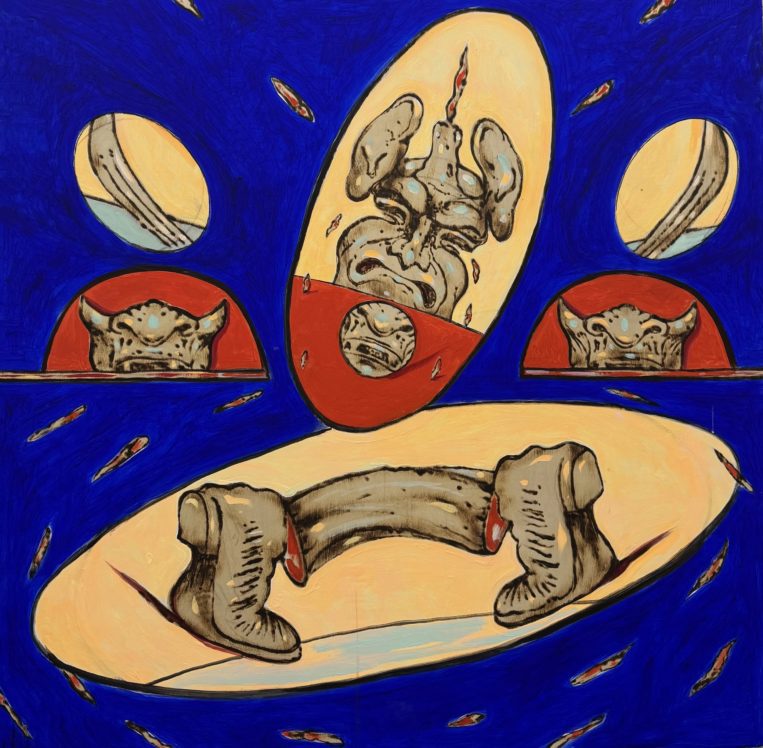Oil & acrylic on burnt & carved wood